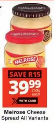 Checkers offers a wide collection of products, besides the Melrose Cheese Spread All Variants. Keep an eye on the weekly Checkers catalogue to find the best specials and promotions. Besides Melrose Cheese Spread All Variants, you can also find the following offers: Melrose Cheese Spread All Variants, Melrose Cheese Spread & Melrose Cheese Spread.