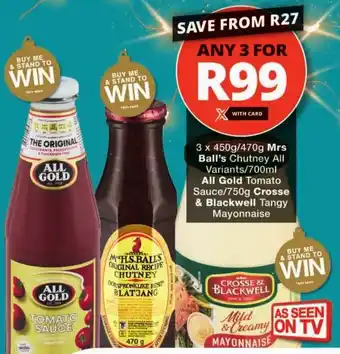 Mrs Ball's Chutney All Variants/ All Gold Tomato Sauce/ Crosse & Blackwell Tangy Mayonnaise promotion at Checkers