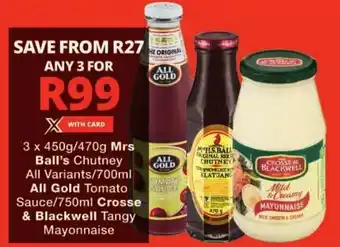 Mrs Ball's Chutney All Variants/ All Gold Tomato Sauce/ Crosse & Blackwell Tangy Mayonnaise promotion at Checkers