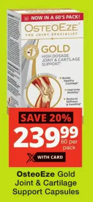 The price of OsteoEze Gold Joint & Cartilage Support Capsules can be found at the top of the page, together with the dates during which the special is available. You can also check the price in the current Checkers catalogue or on the Checkers website. Promotional offers assure you of buying Checkers products at the lowest price.