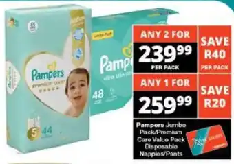 Pampers Jumbo Pack/ Premium Care Value Pack Disposable Nappies/ Pants promotion at Checkers