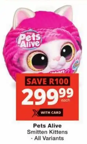 The price of Pets Alive Smitten Kittens can be found at the top of the page, together with the dates during which the special is available. You can also check the price in the current Checkers catalogue or on the Checkers website. Promotional offers assure you of buying Checkers products at the lowest price.