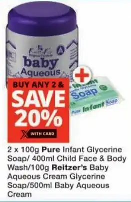 Pure Infant Glycerine Soap/ Child Face & Body Wash/ Reitzer's Baby Aqueous Cream Glycerine Soap/ Baby Aqueous Cream promotion at Checkers