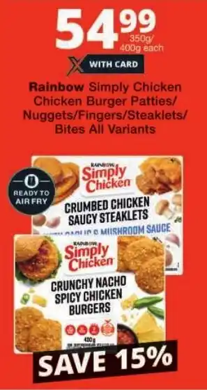 Rainbow Simply Chicken Chicken Burger Patties/ Nuggets/ Fingers/ Steaklets/ Bites All Variants offers and online specials, directly from Checkers