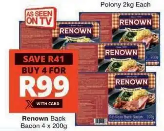 Renown Back Bacon 4 x 200g offers and online specials, directly from Checkers