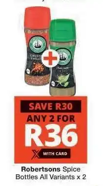 Now on special at Checkers: Robertsons Spice Bottles All Variants x 2 ✅ Valid from 19-01 to 8-02.