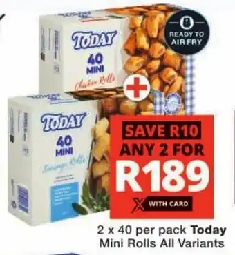 Checkers offers a wide collection of products, besides the Today Mini Rolls All Variants. Keep an eye on the weekly Checkers catalogue to find the best specials and promotions. Besides Today Mini Rolls All Variants, you can also find the following offers: Today Frozen Pastry Snacks All Variants, TODAY FROZEN BEEF SAUSAGE ROLLS & Today Party Pack Sausage Rolls Assorted 40s.