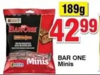 This special is available in various stores, view all products to get the cheapest Bar One Minis. If you'd like to find out whether this product has a bigger discount in another store, check the category 'Grocery stores'. You may also find these specials interesting: Nestlé Bar-One, KitKat, Smarties or Tex Chocolate Minis Bag 135-189g, NESTLÉ SMARTIES/KITKAT/BAR ONE/TEX MINIS CHOCOLATE 135g/189g each & Bar One Cake.