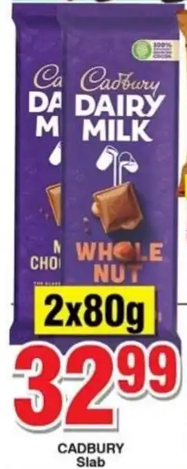 This special is available in various stores, view all products to get the cheapest Cadbury Slab. If you'd like to find out whether this product has a bigger discount in another store, check the category 'Grocery stores'. You may also find these specials interesting: CADBURY CHOCOLATE SLAB, Cadbury Chocolate Slab Asstd & Cadbury Chocolate Slab Asstd..