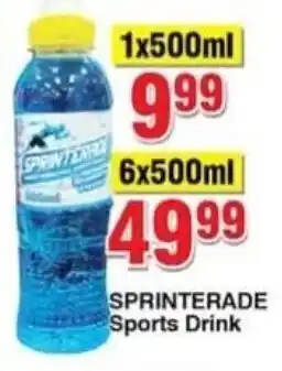 This special is available in various stores, view all products to get the cheapest SPRINTERADE Sports Drink. If you'd like to find out whether this product has a bigger discount in another store, check the category 'Grocery stores'. You may also find these specials interesting: Energade Sports Drink, THIRSTI Sports Drink & Powerade Sports Drink.