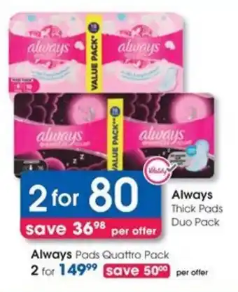 Now on special at Clicks: Always Thick Pads Duo Pack ✅ Valid from 30-12 to 12-01.
