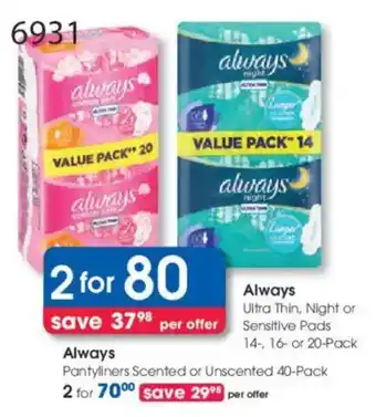 Always Ultra Thin, Night or Sensitive Pads offers and online specials, directly from Clicks