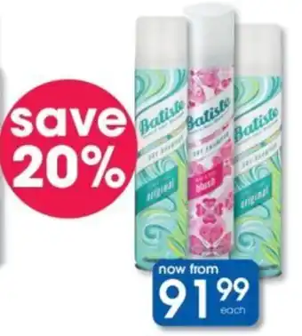 The price of Batiste Dry Shampoo can be found at the top of the page, together with the dates during which the special is available. You can also check the price in the current Clicks catalogue or on the Clicks website. Promotional offers assure you of buying Clicks products at the lowest price.