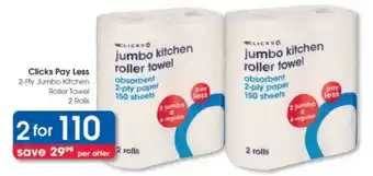 Clicks Pay Less 2-Ply Jumbo Kitchen Roller Towel offers and online specials, directly from Clicks