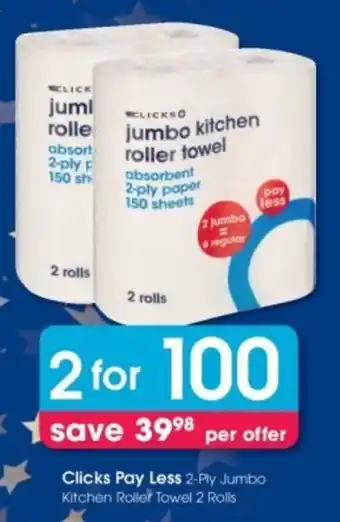 Clicks Pay Less 2-Ply Jumbo Kitchen Roller Towel promotion at Clicks