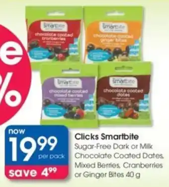 Clicks Smartbite Sugar-Free Dark or Milk Chocolate Coated Dates, Mixed Berries, Cranberries or Ginger Bites promotion at Clicks