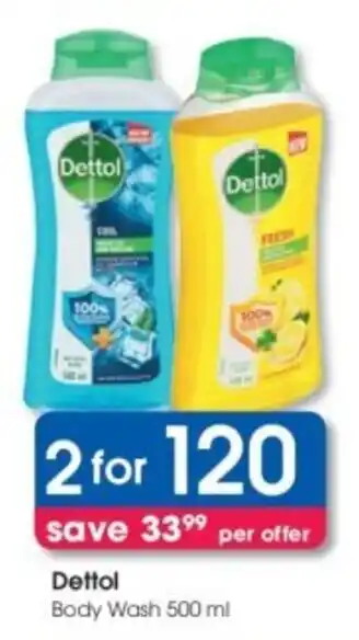 The price of Dettol Body Wash can be found at the top of the page, together with the dates during which the special is available. You can also check the price in the current Clicks catalogue or on the Clicks website. Promotional offers assure you of buying Clicks products at the lowest price.