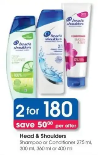 This special is available in various stores, view all products to get the cheapest Head & Shoulders Shampoo or Conditioner. If you'd like to find out whether this product has a bigger discount in another store, check the category 'Beauty & Pharmacy'. You may also find these specials interesting: HEAD & SHOULDERS Shampoo or Conditioner, Head & Shoulders Shampoo Or Conditioner 275ml/360ml/400ml-For 2 & HEAD & SHOULDERS Shampoo or Conditioner.