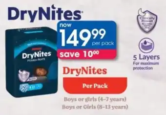 The price of Huggies DryNites can be found at the top of the page, together with the dates during which the special is available. You can also check the price in the current Clicks catalogue or on the Clicks website. Promotional offers assure you of buying Clicks products at the lowest price.