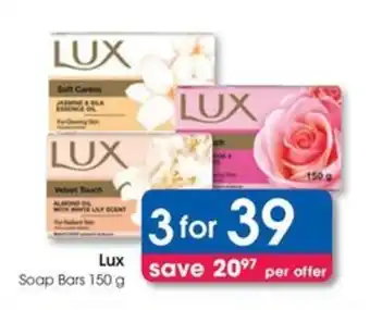 This special is available in various stores, view all products to get the cheapest Lux Soap Bars. If you'd like to find out whether this product has a bigger discount in another store, check the category 'Beauty & Pharmacy'. You may also find these specials interesting: Lux Bath Soap, LUX Beauty Soap & Lifebuoy or Lux Soap.