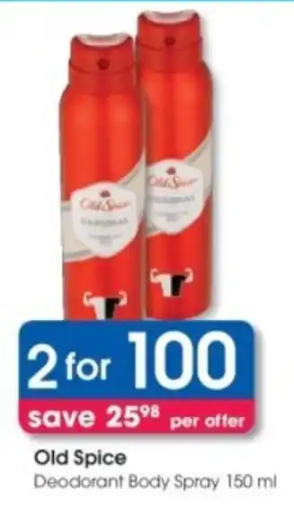This Old Spice Deodorant Body Spray is currently part of a special promotion at Clicks. All information regarding the current price, promotion terms, and validity period can be found on this page. You can also explore similar offers and promotions related to Old Spice Deodorant Body Spray, helping you make the best possible choice.