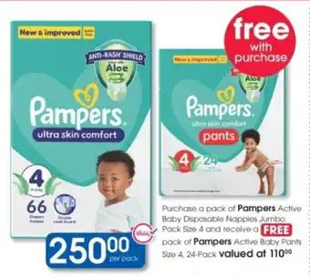 Purchase a pack of Pampers Active Baby Disposable Nappies Jumbo Pack Size 4 and receive a FREE pack of Pampers Active Baby Pants Size 4, 24-Pack valued at 110.00