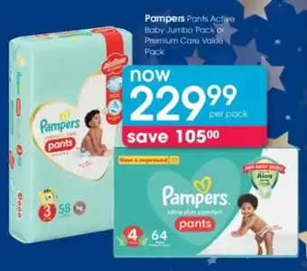 Pampers Pants Active Baby Jumbo Pack or Premium Care Value Pack Offer at Clicks
