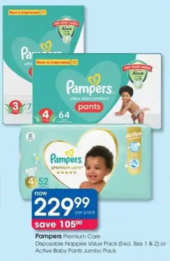 Pampers Premium Care Disposable Nappies Value Pack or Active Baby Pants Jumbo Pack offers and online specials, directly from Clicks