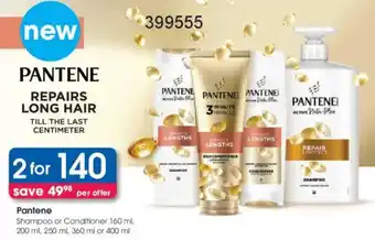 Clicks offers a wide collection of products, besides the Pantene Shampoo or Conditioner. Keep an eye on the weekly Clicks catalogue to find the best specials and promotions. Besides Pantene Shampoo or Conditioner, you can also find the following offers: PANTENE Shampoo or Conditioner, Pantene Shampoo OR Conditioner Assorted & Pantene Shampoo Or Conditioner-For 2 x 160ml/250ml/360ml/400ml.