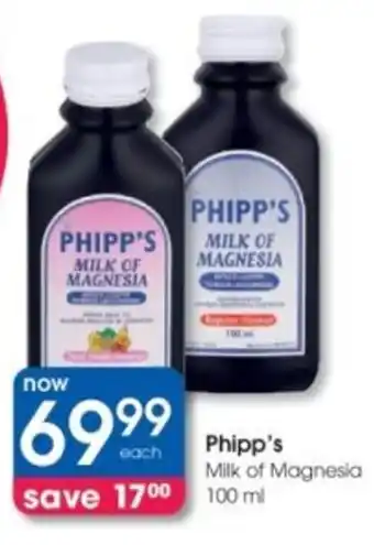 The Phipp's Milk of Magnesia is available this week at Clicks as part of a special promotion. On this page, you’ll find everything about the promotional price, terms, and current specials. Browse related promotions and offers for Phipp's Milk of Magnesia to make sure you don’t miss out.