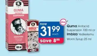 Quma Antacid Suspension or Imbiza Yezikelemu Worm Syrup Discount at Clicks