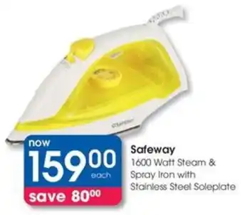 Safeway 1600 Watt Steam & Spray Iron with Stainless Steel Soleplate promotion at Clicks