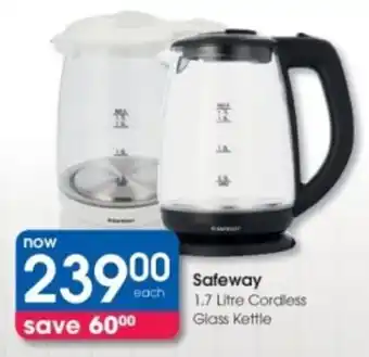 The Safeway Cordless Glass Kettle is now available with a discount at Clicks. On this page, you’ll find everything about the current price, promotion conditions, and how long the offer is valid. Also explore other offers and promotions for Safeway Cordless Glass Kettle to make a smart and cost-effective choice.