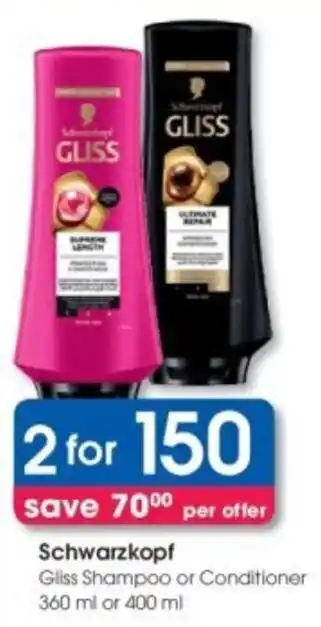 Schwarzkopf Gliss Shampoo or Conditioner Discount at Clicks