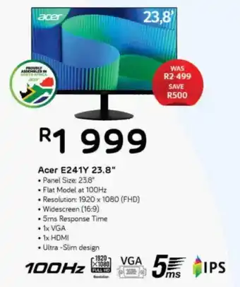 Computer Mania offers a wide collection of products, besides the Acer E241Y 23.8". Keep an eye on the weekly Computer Mania catalogue to find the best specials and promotions. Besides Acer E241Y 23.8", you can also find the following offers: Motorola E15, Hisense E35 & ASUS E510.