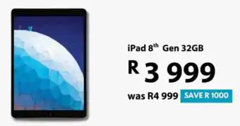 This special is available in various stores, view all products to get the cheapest Apple iPad 8th Gen 32GB. If you'd like to find out whether this product has a bigger discount in another store, check the category 'Electronics'. You may also find these specials interesting: Apple iPad A16, Apple iPad 11inch Wifi 128GB & Apple iPad A16 11" WiFi.