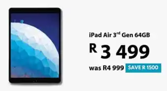 This special is available in various stores, view all products to get the cheapest Apple iPad Air 3rd Gen 64GB. If you'd like to find out whether this product has a bigger discount in another store, check the category 'Electronics'. You may also find these specials interesting: Apple iPad A16, Apple iPad A16 & Apple iPad 11-inch Wi-Fi 128GB.