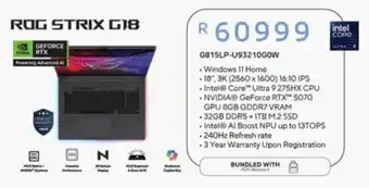 This ASUS ROG Strix G18 is currently available as part of a special promotion at Computer Mania. Be sure to check the current promotions filled with competitive prices and deals. You can order ASUS ROG Strix G18 online via Computer Mania website or get it at the best available price. Cataloguespecials.co.za collects the most relevant ASUS ROG Strix G18 offers and specials for you. Want to be notified first? Click the bell icon to receive a free alert when the product is part of a new promotion or available again.