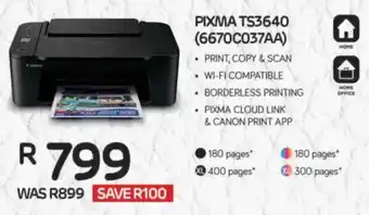 This special is available in various stores, view all products to get the cheapest Canon PIXMA TS3640 Printer. If you'd like to find out whether this product has a bigger discount in another store, check the category 'Electronics'. You may also find these specials interesting: Canon Pixma TS3640 Printer, Canon Pixma TS3640 Multi-function Printer & Canon Pixma TS3640 Colour Multifunction Inkjet Printer 850021121.