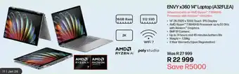 This special is available in various stores, view all products to get the cheapest HP Envy x360 14" Laptop. If you'd like to find out whether this product has a bigger discount in another store, check the category 'Electronics'. You may also find these specials interesting: HP Laptop, HP 15s Ryzen 3 Laptop & HP OmniBook X 16 AMD Ryzen 7 AI Laptop.
