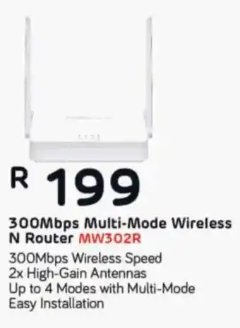 Computer Mania offers a wide collection of products, besides the Mercusys 300Mbps Multi-Mode Wireless N Router. Keep an eye on the weekly Computer Mania catalogue to find the best specials and promotions. Besides Mercusys 300Mbps Multi-Mode Wireless N Router, you can also find the following offers: Mercusys 300Mbps Enhanced Wireless N Router, Mercusys 300Mbps Wireless N 4G LTE Router & Mercusys AC1200 Dual-Band Wireless Router.
