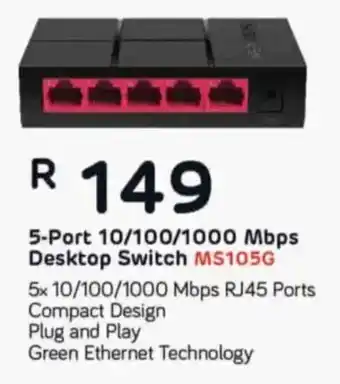 This Mercusys 5-Port 10/100/1000 Mbps Desktop Switch is currently part of a special promotion at Computer Mania. All information regarding the current price, promotion terms, and validity period can be found on this page. You can also explore similar offers and promotions related to Mercusys 5-Port 10/100/1000 Mbps Desktop Switch, helping you make the best possible choice.