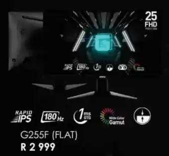 This special is available in various stores, view all products to get the cheapest Msi G255F Flat. If you'd like to find out whether this product has a bigger discount in another store, check the category 'Electronics'. You may also find these specials interesting: Msi Pro MP2412 Flat, Msi G27C4E3 & Msi Cyborg 15.