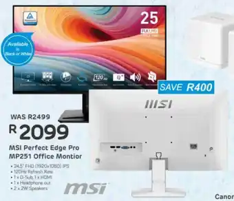 Computer Mania offers a wide collection of products, besides the MSI Perfect Edge Pro MP251 Office Montior. Keep an eye on the weekly Computer Mania catalogue to find the best specials and promotions. Besides MSI Perfect Edge Pro MP251 Office Montior, you can also find the following offers: Msi Pro MP2412 Flat, MSI PRO Business & Productivity Monitor & HP Office Jet Pro 8123 Printer.