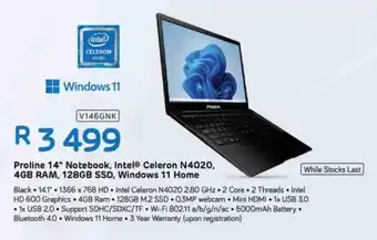 Proline 14" Notebook, Intel Celeron N4020, 4GB RAM, 128GB SSD, Windows 11 Home offers and online specials, directly from Computer Mania
