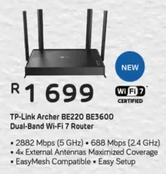 Now on special at Computer Mania: TP-Link Archer BE220 BE3600 Dual-Band Wi-Fi 7 Router ✅ Valid from 31-12 to 31-01.