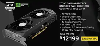 Computer Mania offers a wide collection of products, besides the Zotac gaming geforce rtx 5070 twin edge 12gb gddr7 graphics card. Keep an eye on the weekly Computer Mania catalogue to find the best specials and promotions. Besides Zotac gaming geforce rtx 5070 twin edge 12gb gddr7 graphics card, you can also find the following offers: ZOTAC Gaming GeForce RTX 5050 TwinEdge 8GB GDDR6 Graphics Card, ZOTAC Gaming GeForce RTX 5060 TwinEdge 8GB GDDR7 Graphics Card & Zotac gaming geforce rtx 5090 solid core 32gb gddr7 graphics card.