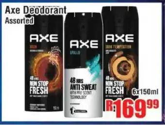 This special is available in various stores, view all products to get the cheapest Axe Deodorant Assorted. If you'd like to find out whether this product has a bigger discount in another store, check the category 'Wholesale'. You may also find these specials interesting: Axe Deodorant, AXE Aerosol Deodorant & AXE Aerosol Deodorant.