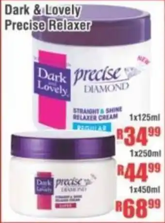This special is available in various stores, view all products to get the cheapest Dark & Lovely Precise Relaxer. If you'd like to find out whether this product has a bigger discount in another store, check the category 'Wholesale'. You may also find these specials interesting: Dark & Lovely Precise Relaxer, Dark & Lovely Relaxer Kit & Dark & Lovely Oil Moist Spray.
