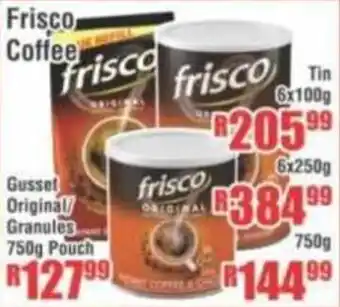 This special is available in various stores, view all products to get the cheapest Frisco Coffee. If you'd like to find out whether this product has a bigger discount in another store, check the category 'Wholesale'. You may also find these specials interesting: Frisco Original/Granules Chicory & Coffee 250g+Freshpak Rooibos Teabag 20+Ellis Creamer 125g-For All, Coffee Mug 300ml & Trekker Coffee.
